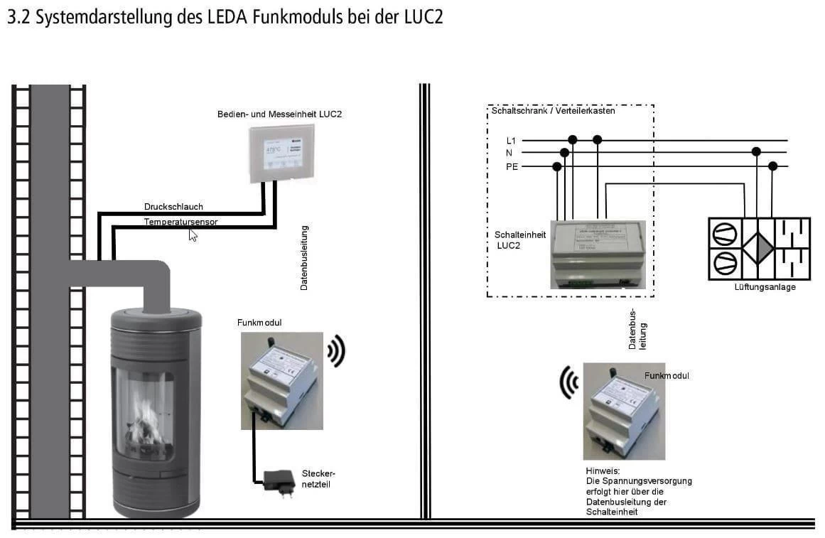 Bei der Montage des LEDA Unterdruck Controllers LUC an Kamin- und Kachelofenanlagen in Räumlichkeiten, die sich nicht gerade im Bau befinden, ist das Funkmodul für den LEDA Unterdruckwächter LUC die ideale Lösung, um ein erneutes, großflächiges Öffnen der Wände zum Verlegen von Kabeln zu umgehen. Die Daten werden kabellos innerhalb der Datenbusleitung übertragen.