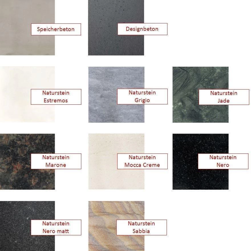 Beim Material Beton kann es produktionsbedingt zu Abweichungen in Farbe und Oberflächenbeschaffenheit (Poren) kommen. Das Material Naturstein ist ein in freier Natur gewachsener Werkstoff, dem bei der Herstellung der Fronten lediglich der letzte Schliff verliehen wird. Abweichungen in Farbe, Struktur und Aderung sind daher ganz natürlich. Die genannten Charakteristika unterstreichen den individuellen Charakter des Kamines und stellen keine Basis für eine Reklamation der Kaminbausätze dar.