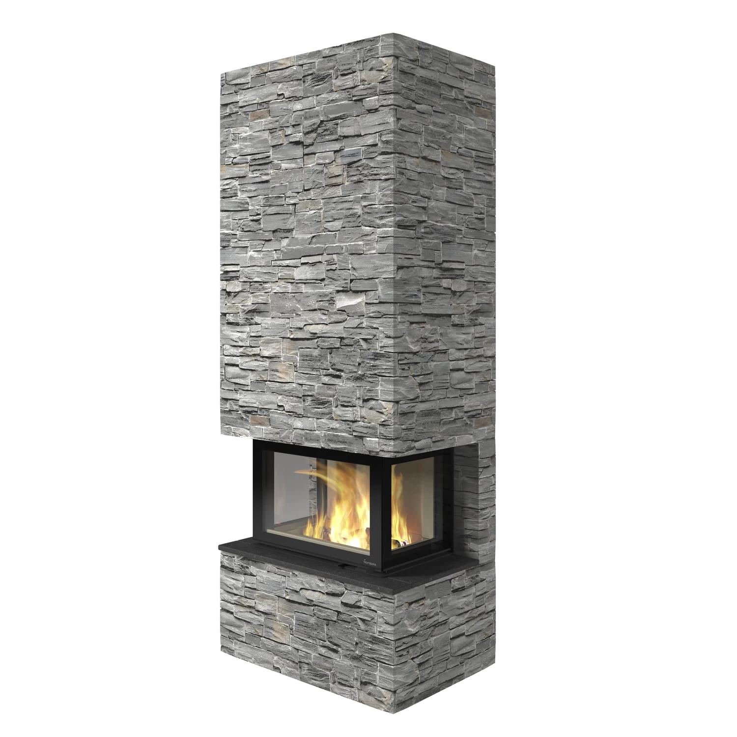 Die Kaminbausätze des norwegischen Herstellers Nordpeis überzeugen durch moderne Designs im angesagten Skandinavischen Stil, den Einsatz hochwertiger Materialien und große Produktvielfalt sowie mit kinderleichtem Aufbau. Der Korpus des Kaminbausatzes Davos U High Stone wird gefertigt aus Spezialbeton, dem sogenannten Shape Stone Light, dessen hohe Haltbarkeit und Festigkeit durch eine, in den belasteten Bereichen sogar verstärkte, Faserarmierung erlangt wird. Das Material hat eine leichte Speicherwirkung und sorgt so auch nach dem Abbrand für eine angenehme Strahlungswärme, dank welcher ein nachhaltig wohlig-warmes Raumklima geschaffen wird. Bei dem Kaminbausatz Davos U High Stone handelt es sich um einen Bausatz für einen mit Naturstein verkleideten 3-Seiten-Kamin mit einer stolzen Höhe ca. 2,38 m und einer großzügigen Panoramaverglasung, welche den Blick des Betrachters aus beinahe jeder Perspektive auf das herrlich prasselnde Kaminfeuer in seinem Inneren freigibt und den Kamin zu einem aufsehenerregenden Blickfang Ihrer ganz persönlichen Raumgestaltung werden lässt. Er verfügt über ein hochmodernes, minimalistisches Design mit klaren Linien und, für ein besonders markantes Erscheinungsbild des Davos U High Stone, eine Verkleidung aus handverlesenem Naturstein.