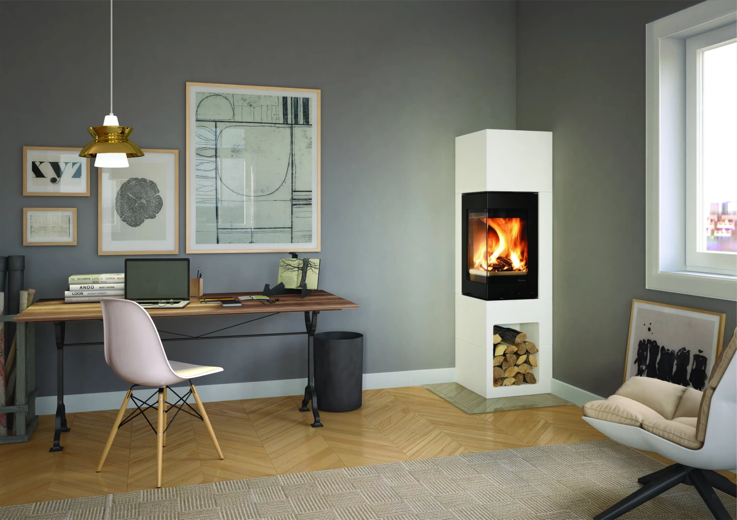 Die Kaminbausätze des norwegischen Herstellers Nordpeis überzeugen durch moderne Designs im angesagten Skandinavischen Stil, den Einsatz hochwertiger Materialien und große Produktvielfalt sowie mit kinderleichtem Aufbau. Der Korpus des Kaminbausatzes Odense wird gefertigt aus Spezialbeton, dem sogenannten Shape Stone Light, dessen hohe Haltbarkeit und Festigkeit durch eine, in den belasteten Bereichen sogar verstärkte, Faserarmierung erlangt wird. Das Material hat eine leichte Speicherwirkung und sorgt so auch nach dem Abbrand für eine angenehme Strahlungswärme, dank welcher ein nachhaltig wohlig-warmes Raumklima geschaffen wird. Bei dem Kaminbausatz Odense handelt es sich um einen Bausatz für einen Eckkamin mit geringer Grundfläche, ausgezeichnet geeignet auch für Räume mit wenig Platzangebot, mit 2-seitiger Verglasung, die den Kamin zu einem besonderen Blickfang Ihrer ganz persönlichen Raumgestaltung macht. Bei der Gestaltung des Odense lag der Fokus auf einer klaren Linienführung sowie auf der spektakulären Sicht auf das herrlich prasselnde Kaminfeuer in seinem Inneren, erlangt durch die großzügige Eckscheibe. Besonders praktisch ist das integrierte Holzfach im rechten, unteren Segment. So kann der Brennholzvorrat stets griffbereit und gleichzeitig stilsicher aufbewahrt werden. Der graue Spezialbeton kann darüber hinaus für eine individuelle Gestaltung mit einer Ofenfarbe in Ihrem Wunschfarbton angestrichen werden. Der Anschluss des in diesem Eckkamin verbauten Kamineinsatz Nordpeis N31 kann ganz flexibel oben oder hinten vorgenommen werden.