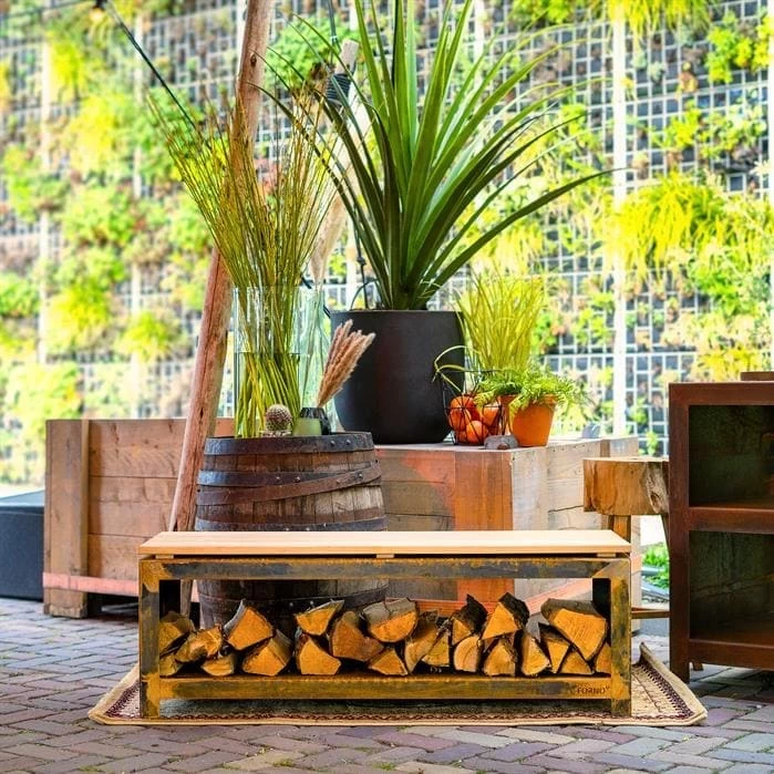 Mit den hochwertigen Kaminholzregalen der Premium-Marke FORNO ist Ihr Brennholzvorrat stets stilvoll und griffbereit aufbewahrt. Mit den banktypischen Abmaßen präsentiert sich das Modell BHSH nicht nur als ideal geeignet zur Aufbewahrung des Holzvorrates direkt neben Ihrer Gartenfeuerstelle, sondern, mit der Auflage aus hochwertigem, strapazierfähigem Hartholz der Dauerhaftigkeitsklasse 2, als stilvolles Sitzmöbel. Neben dem modernen Design punktet das Kaminholz-Regal mit einer äußerst soliden, hochqualitativen Ausführung aus 3 mm starkem Cortenstahl. Die Konstruktion ist vollverschweißt und damit robust und belastbar. Dank den harmonischen Proportionen und der modernen, geradlinigen Formgebung erhalten Sie mit dem BHSH Holzregal ein optisch interessantes und dazu äußerst praktisches Element zur Ergänzung Ihrer individuellen Gartengestaltung.