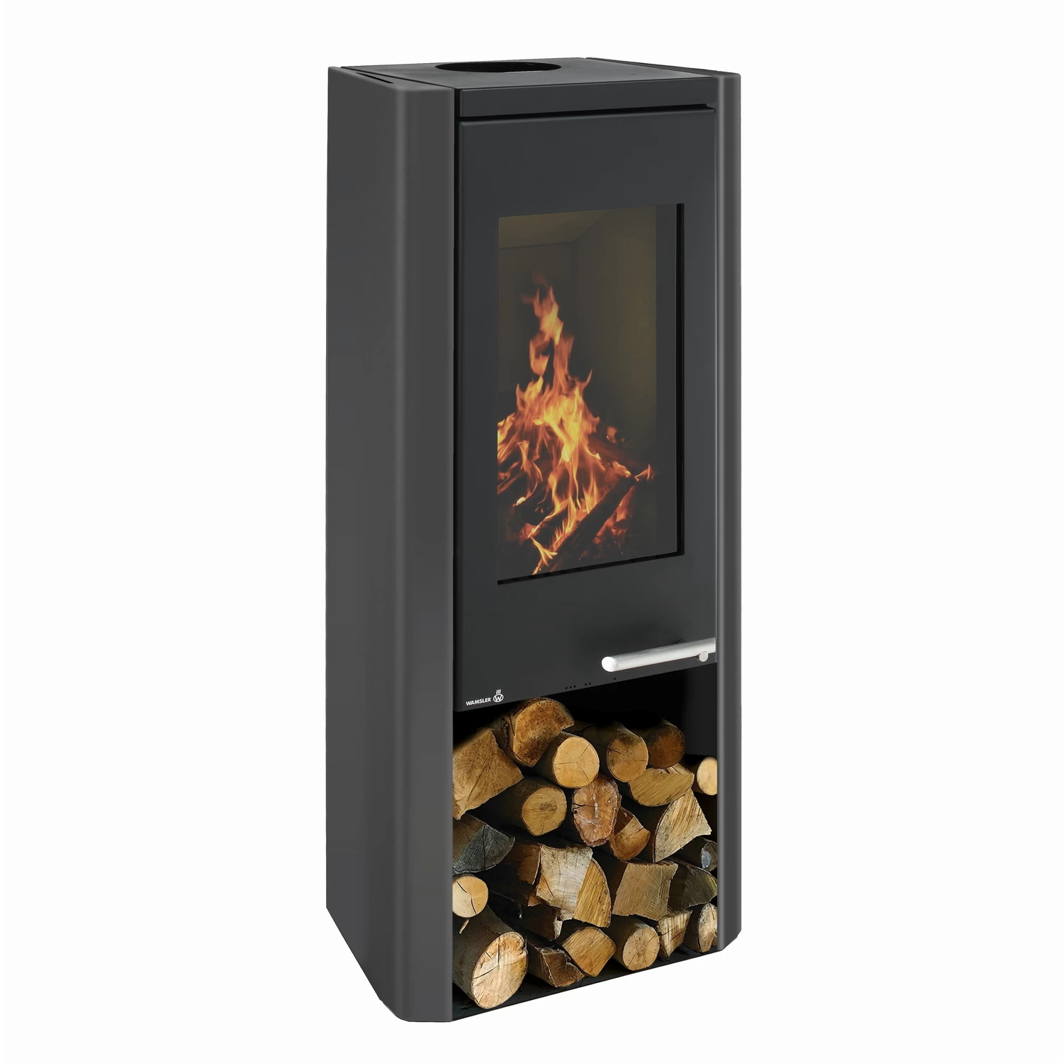 Der Kaminofen Myro des renommierten deutschen Markenherstellers WAMSLER ist mit seinem modernen Design mit eckiger Grundform und sanft abgerundeten Seitenkanten besonders vielseitig einsetzbar, da er sich durch die harmonische Form des in elegantem schwarz lackierten Korpus und der dezenten Gestaltung der beiden erhältlichen Seitenverkleidungen mühelos in das Interieur eines jeden Raumes integrieren lässt. Das integrierte Triple-Air-System sorgt dank optimal positionierter Primär-, Sekundär- und Tertiärluftführung sowie der wirkungsvollen Nachverbrennung der Heizgase für einen extrem effizienten und sauberen Abbrand. Der Myro überzeugt darüber hinaus mit doppelwandigem Korpus und stilvollem Drehgriff aus hochwertigem Edelstahl. Die extra hohe Scheibe ermöglicht einen fabelhaften Blick auf das faszinierende Feuerspiel im Inneren des Kamines. Praktisch ist das integrierte Holzfach im unteren Segment des Kaminofens, dank welchem Ihr Holzvorrat stets griffbereit aufbewahrt ist. Ein weiteres Highlight ist seine Vielseitigkeit hinsichtlich der Brennstoffe, denn der Myro ist zugelassen für Scheitholz sowie für Holz- und Braunkohlebriketts. Auf der Rückseite befindet sich ein Brennstoffwähler zur automatischen Anpassung des Abbrandes an die Eigenschaften des zum Einsatz kommenden Brennstoffes.