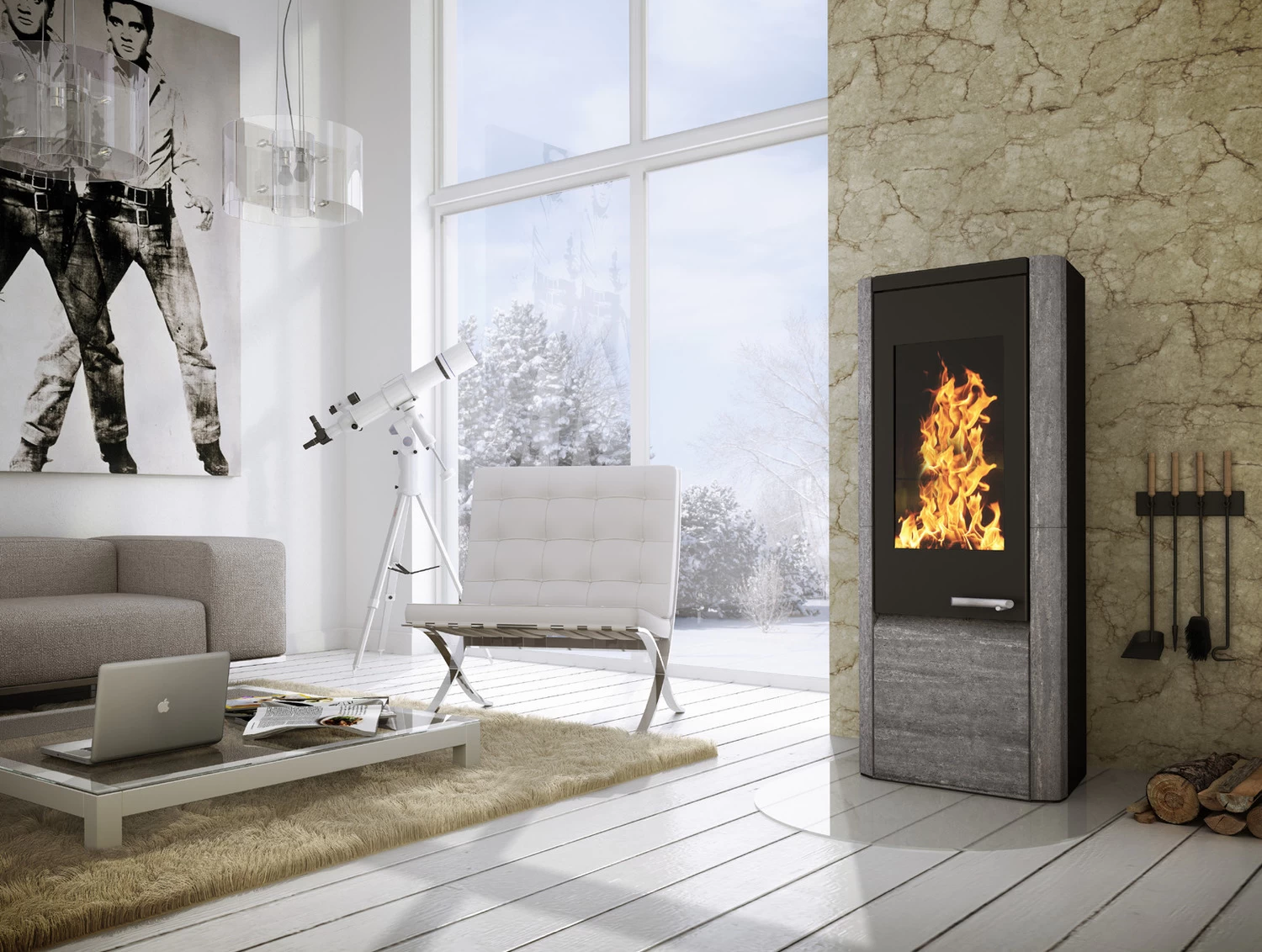 Der raumluftabhängige Schwedenofen ist mit zwei unterschiedlichen Seitenverkleidungen, wahlweise in Stahl Grau oder Naturstein, zur Auswahl bei Kaminprofi24 erhältlich.
