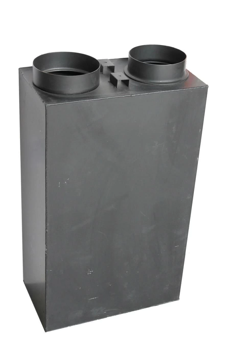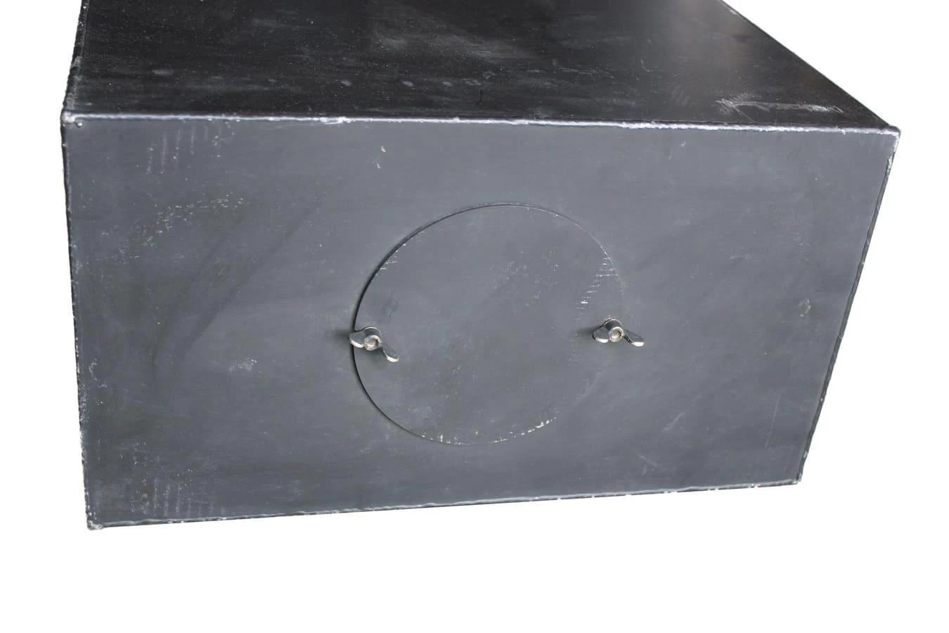 Heizkasten für Kachelofeneinsätze aus 2 mm-Stahlblech geschweißt, eckige Form mit Gasschlitz und Reinigungsöffnung an der Unterseite.