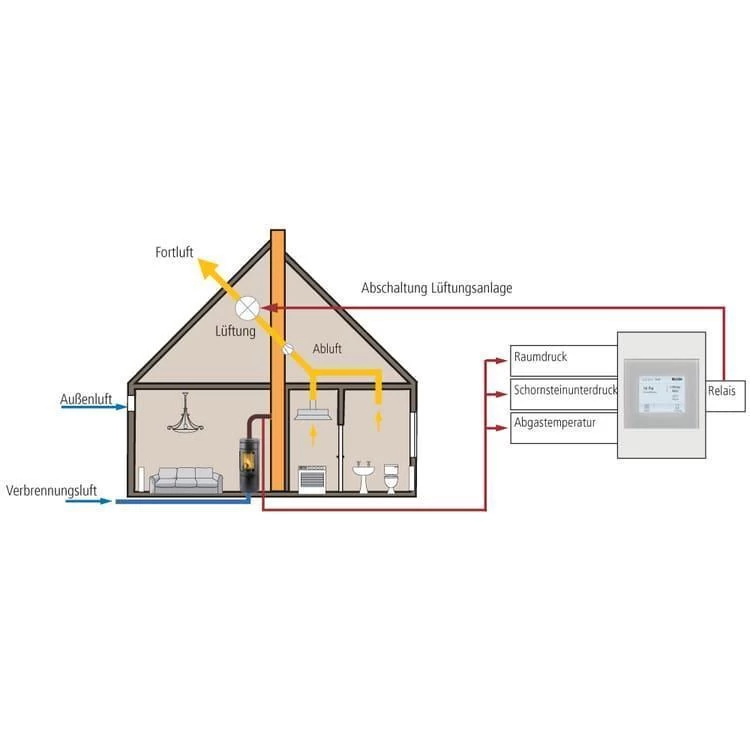 In der Küche surrt die Dunstabzugshaube – und im Wohnzimmer knistert behaglich das Kaminfeuer. Ein Problem? Nicht unbedingt. Aber: Lüftungsanlagen und Dunstabzugshauben mit Außenanschluss arbeiten mit Unterdruck – ebenso wie Ofen, Kamin und Kachelofen, die so ihre Rauchgase über den Schornstein nach außen ableiten. Die Geräte können sich dabei in ihrer Wirkungsweise gegenseitig beeinträchtigen. Eine zu hoch eingestellte oder defekte Lüftungsanlage könnte zum Beispiel bewirken, dass Rauchgase aus der Feuerstätte in den Wohnraum gezogen werden. Aus diesem Grunde wurde der Unterdruck-Controller LUC entwickelt. Bei der Technologie handelt es sich um ein geprüftes, innovatives Steuerungsgerät, das den Betrieb von lufttechnischer Anlage und Feuerstätte optimal aufeinander abstimmt.